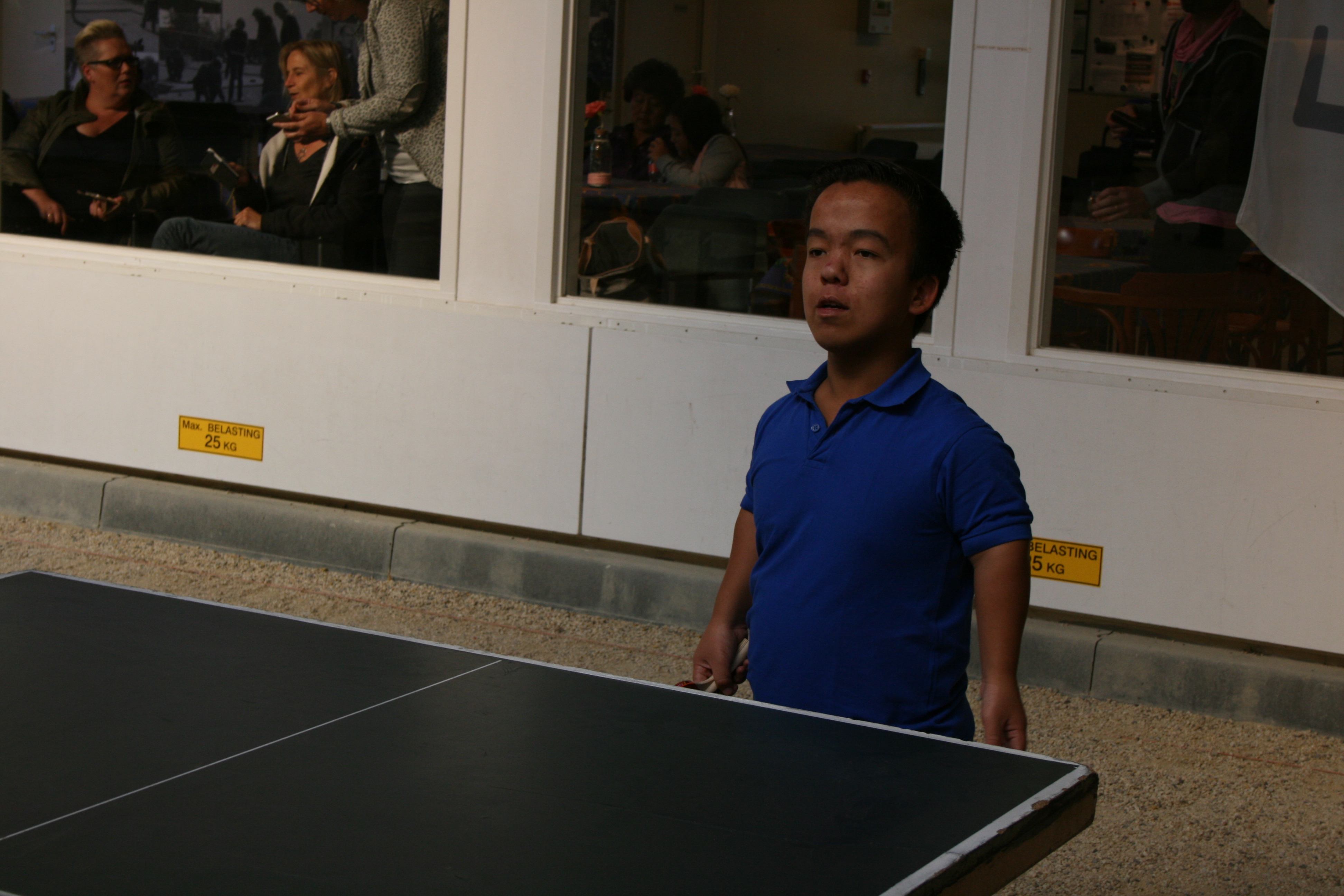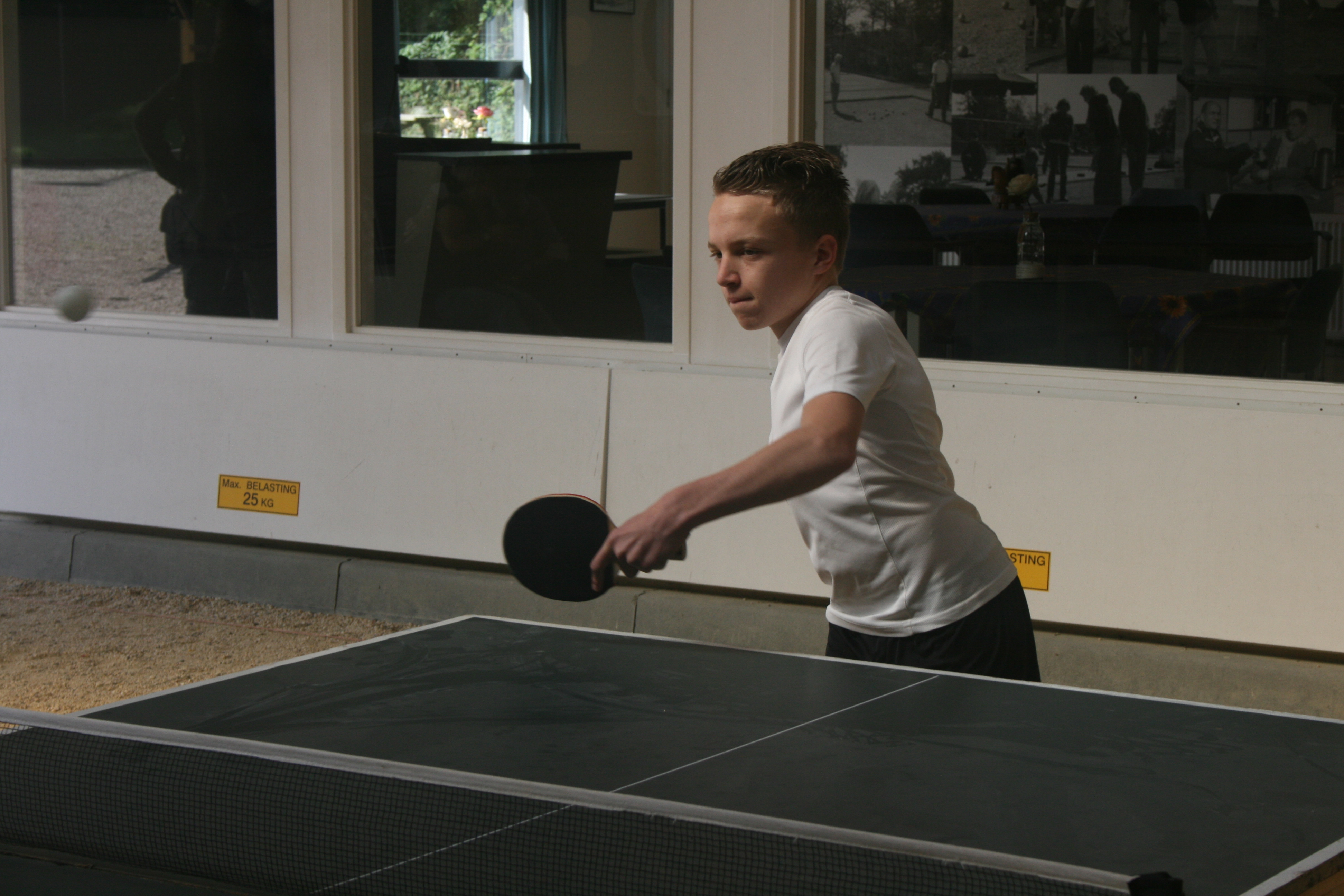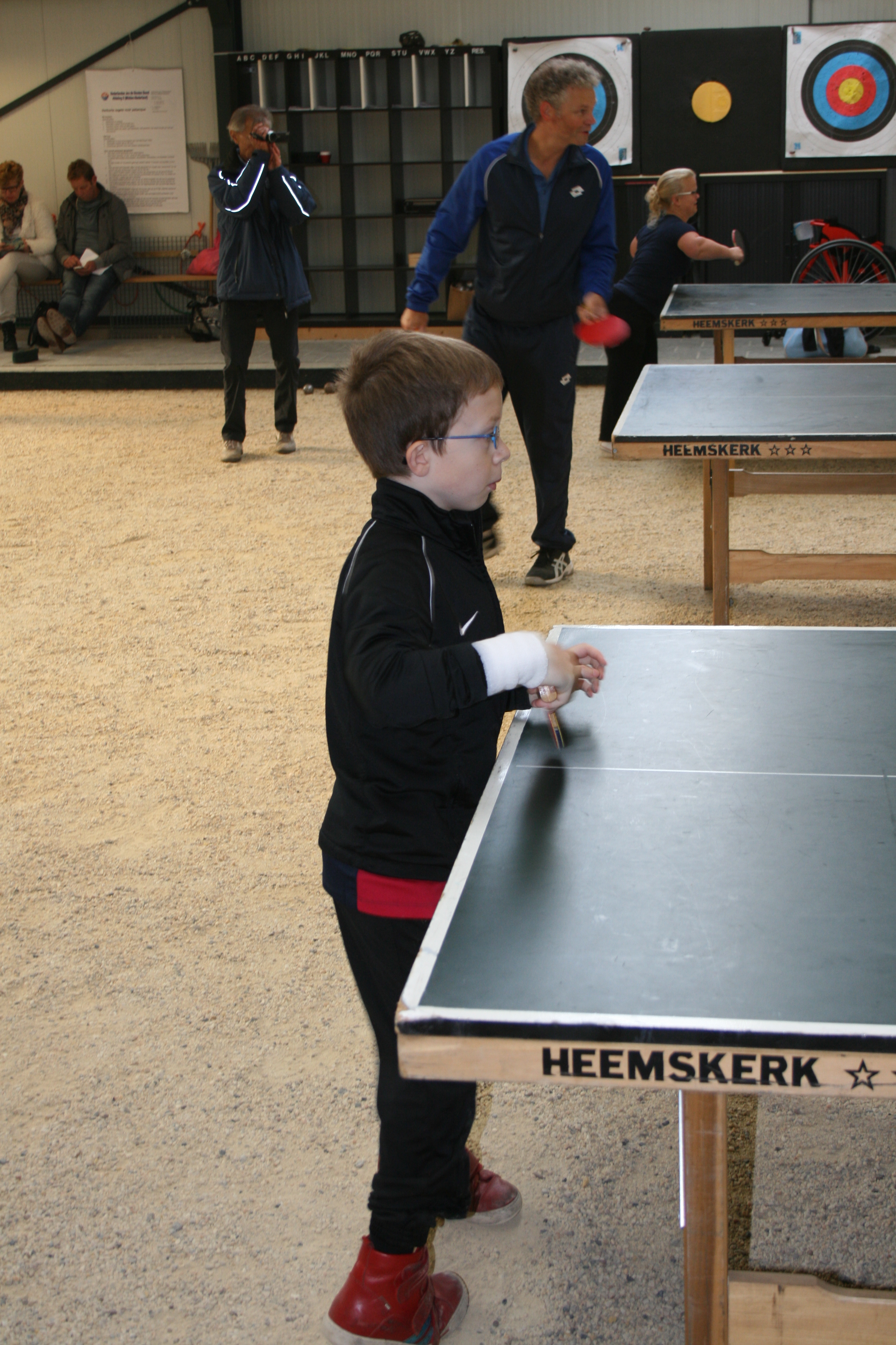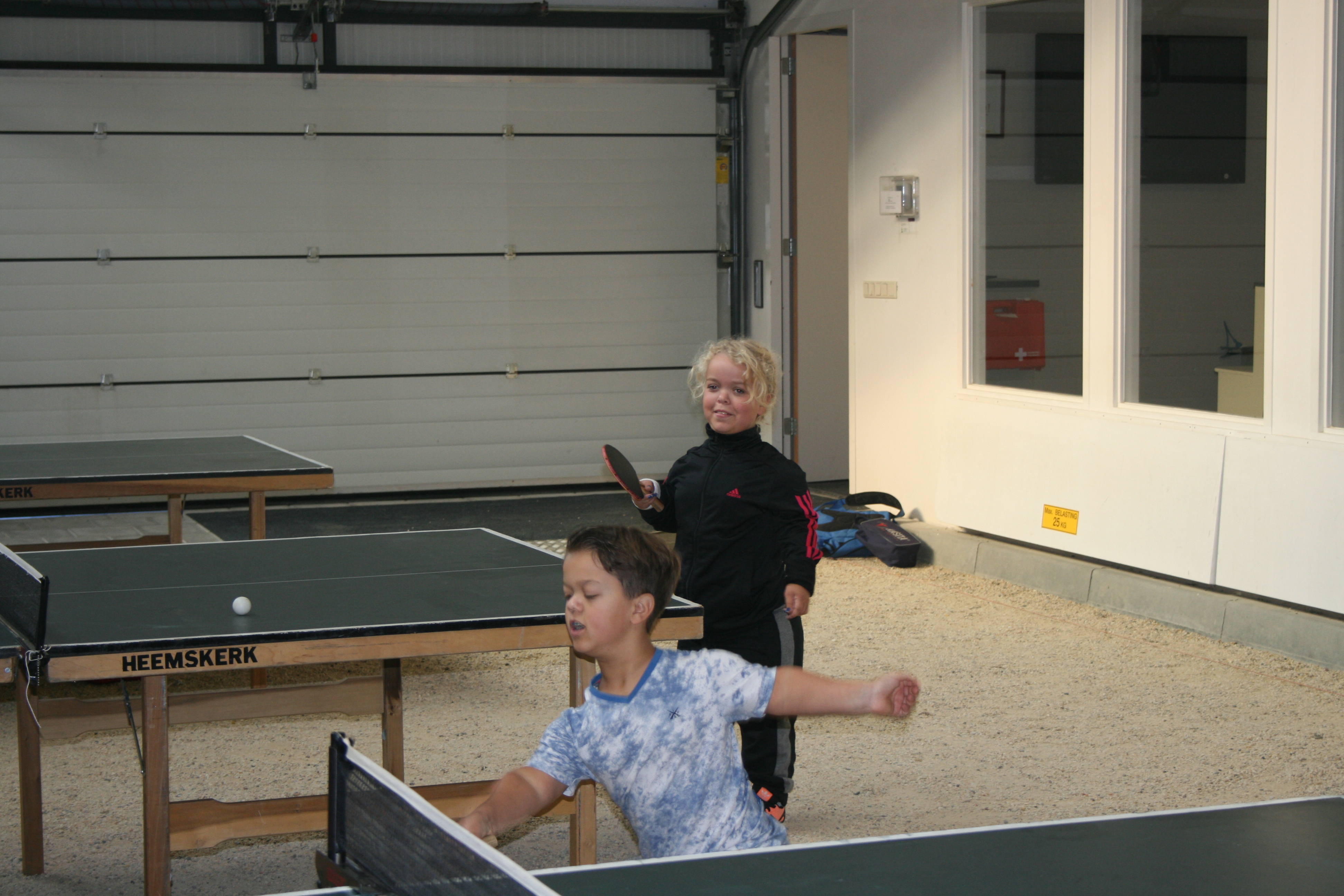 Tafeltennissen met kleine mensen vergt af en toe wat aanpassingsvermogen vanwege de hoogte van de tafel, maar in het algemeen is het geen enkel probleem om de sport te beoefenen vanaf een lengte van ca. een meter. Je houding is noodgedwongen anders doordat je je bat hoger moet houden, soms wel tot boven je schouder. Maar het gaat best en daar waar het lastig werd bood de hal van de Eemschutters, waar de clinic plaatsvond, uitkomst. De grindbodem is er niet echt tafeltennisvriendelijk, maar er is langs de kant een kleine verhoging waar prima een tafel kon worden geplaatst en deze maakte de allerkleinsten zomaar 20 cm groter.IMG_3092