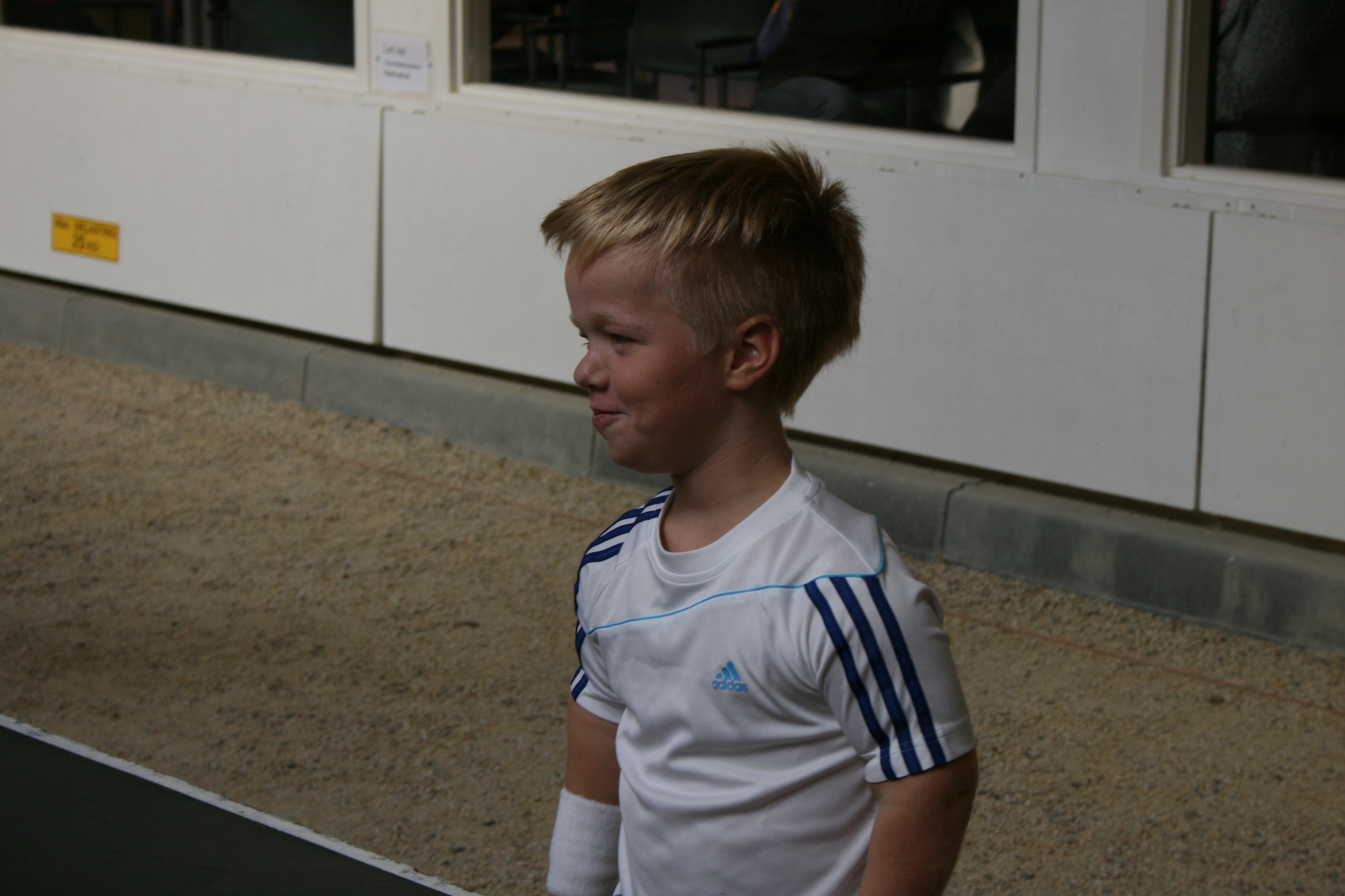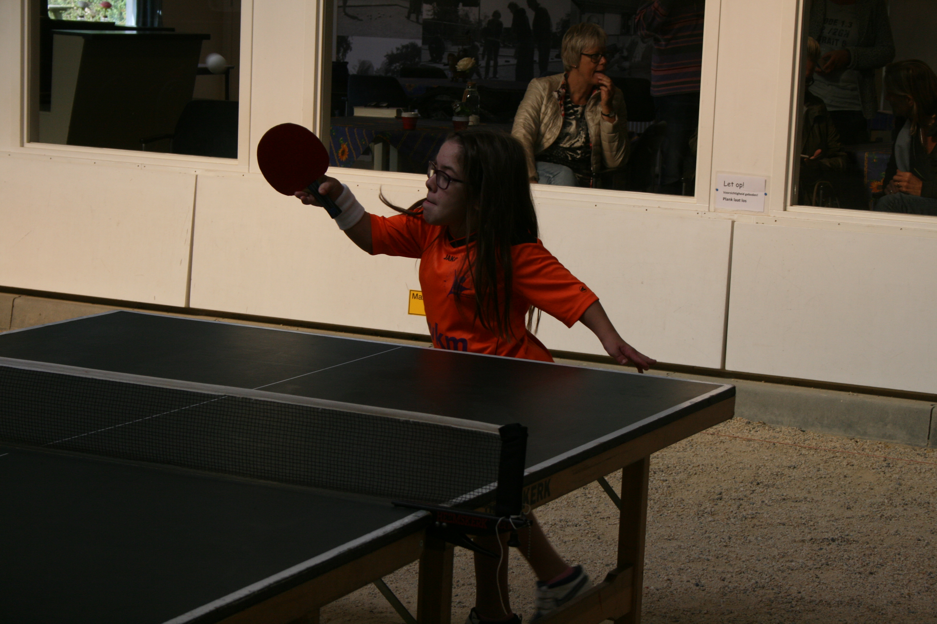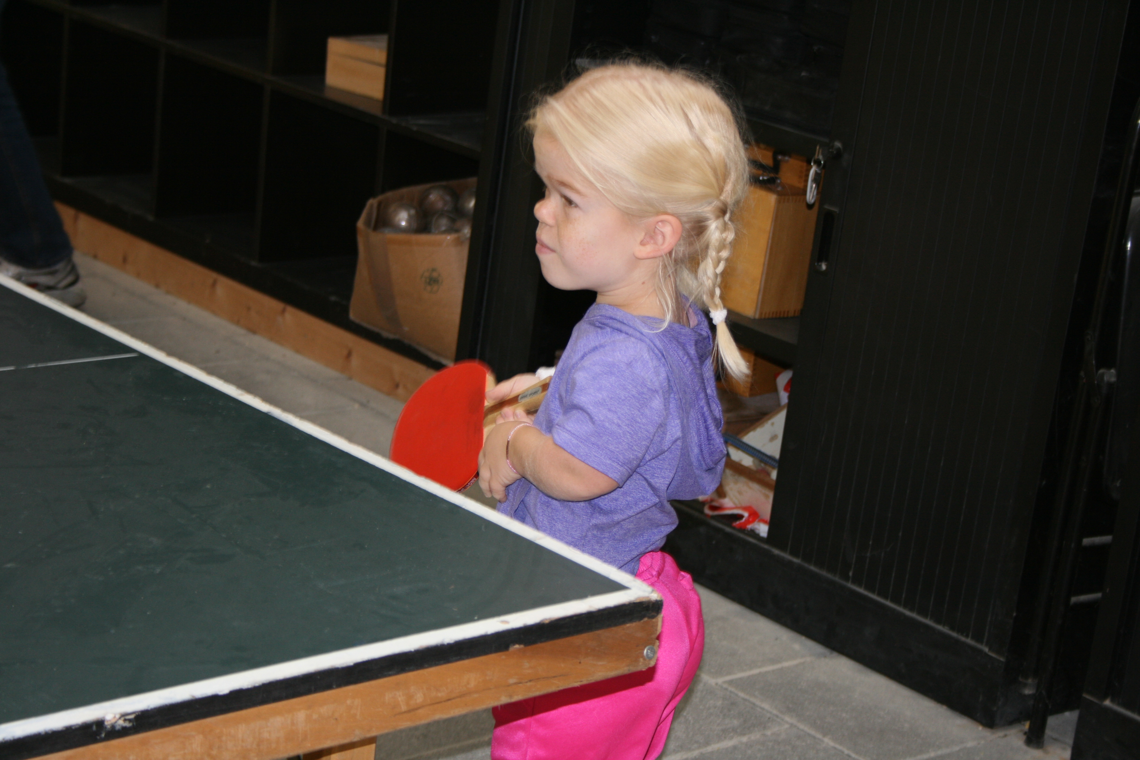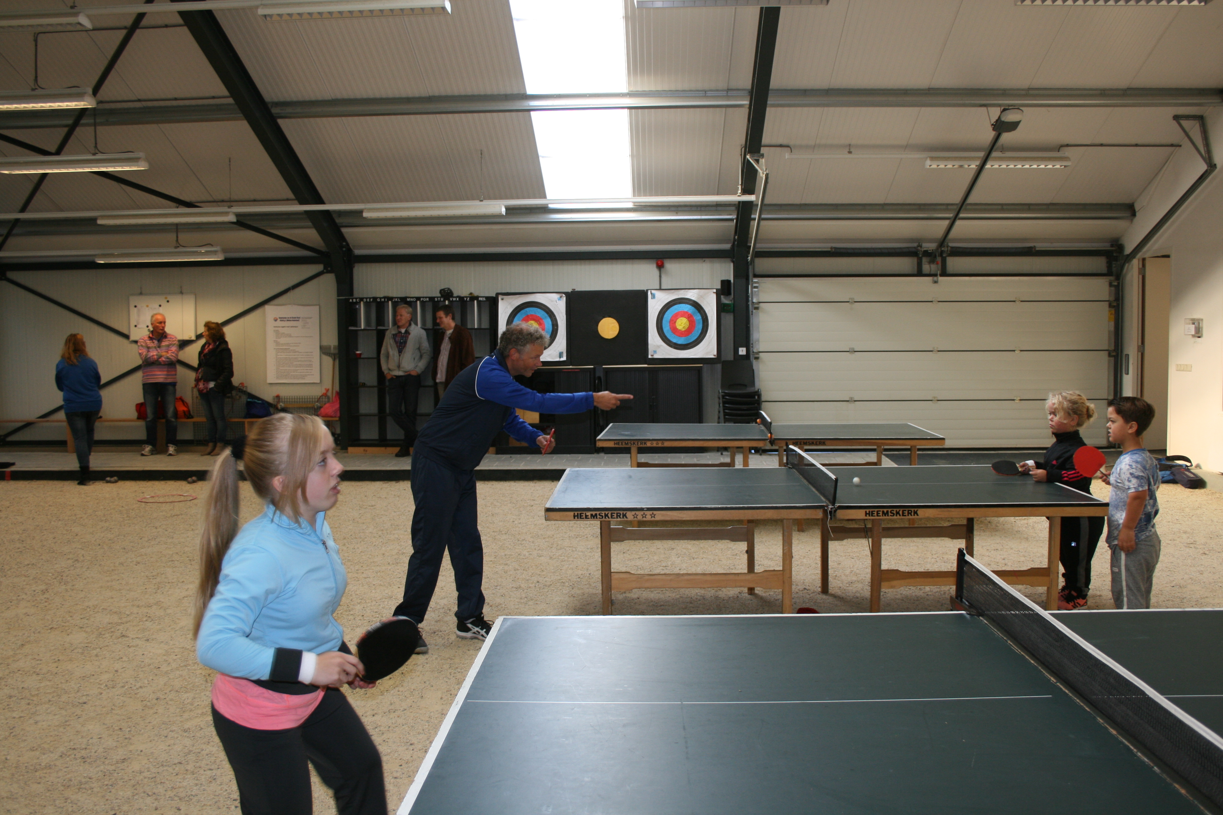 Tafeltennissen met kleine mensen vergt af en toe wat aanpassingsvermogen vanwege de hoogte van de tafel, maar in het algemeen is het geen enkel probleem om de sport te beoefenen vanaf een lengte van ca. een meter. Je houding is noodgedwongen anders doordat je je bat hoger moet houden, soms wel tot boven je schouder. Maar het gaat best en daar waar het lastig werd bood de hal van de Eemschutters, waar de clinic plaatsvond, uitkomst. De grindbodem is er niet echt tafeltennisvriendelijk, maar er is langs de kant een kleine verhoging waar prima een tafel kon worden geplaatst en deze maakte de allerkleinsten zomaar 20 cm groter.IMG_3092