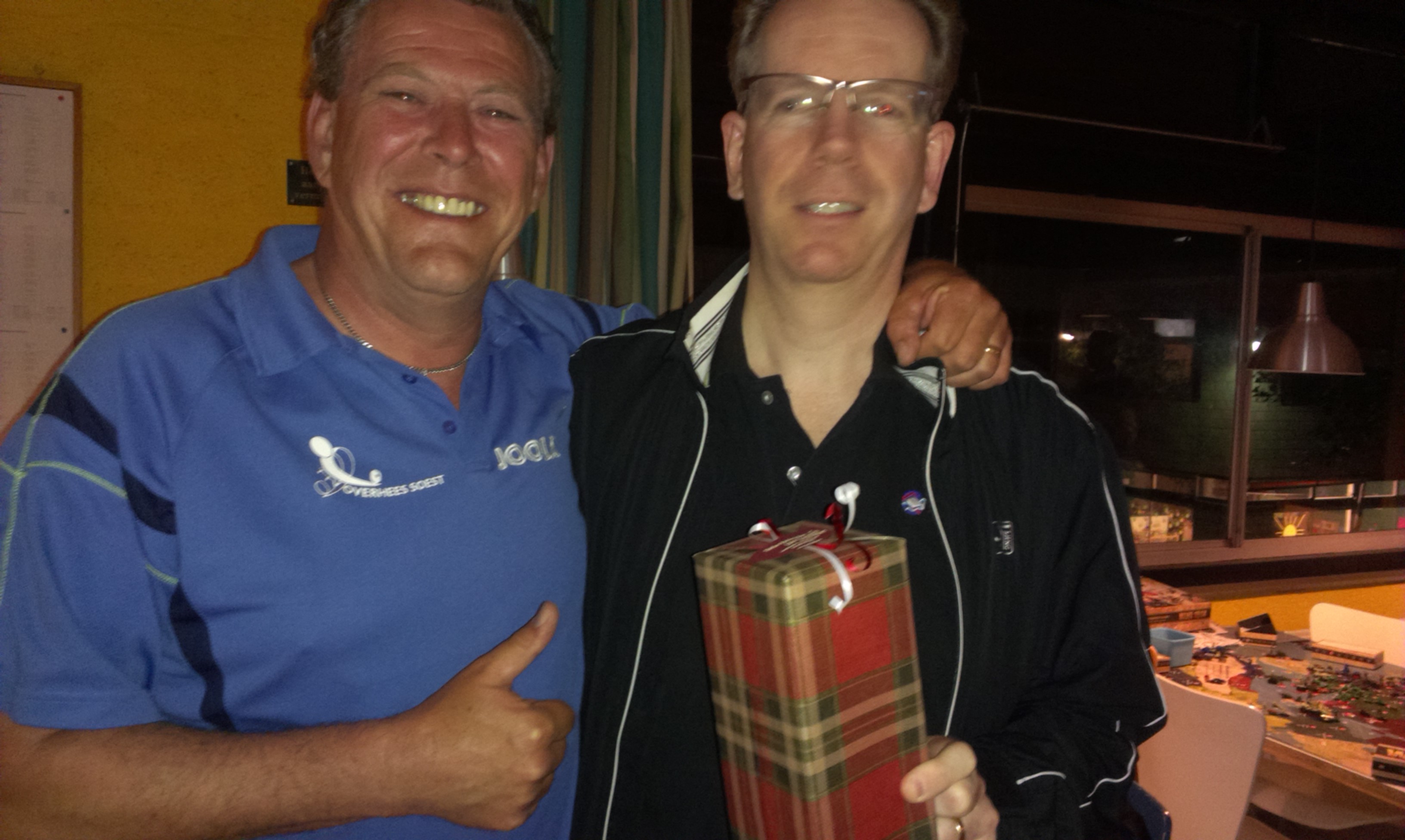In de prijzenregen was er toch ook nog een verrassing voor Mike. Hij mocht dan het podium net niet hebben gehaald, uit handen van voorzitter Jos ontving hij wel een attentie (het had verdacht veel weg van een fles) voor het indrukwekkende feit dat hij dit jaar zijn 30-jarig jubileum als Overhees-lid viert. Een topprestatie!