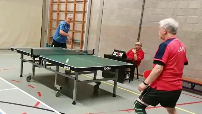 Bekerteam 2 ging op bezoek in Putten bij TVP 2 met gastspeler Gerben de Radder in de gelederen (in iets te krap Overhees-shirt) en dat werd helaas niet de avond van Overhees. Tot en met de dubbels gingen de beide teams gelijk op: Ruben en Rik wonnen hun eerste enkel en samen de dubbel, Mario en Gerben moesten hun tegenstanders feliciteren. Tussenstand 3-3, er leek weinig aan de hand. Maar aan het eind van zijn dubbelpartij knakte er wat in de kuit van Ruben. Uitgerekend de man die zo goed op dreef was in zijn eerste bekercompetitie (5 uit 5 enkelspelzeges) moest de strijd staken, een ongelooflijke aderlating voor het team, dat niet alleen de drie resterende partijen van Ruben moest weggeven aan TVP, maar ook dusdanig van slag was dat ook de anderen niet veel punten meer pakten: Gerben won er nog twee en Mario één en dat was het dan. Einduitslag 12-6, team 2 staat op de laatste plaats en moet een wonder verrichten om zich nog te plaatsen. Het kán wel: als het de laatste poulewedstrijd met 12-6 wint van Hoogland 2 en TVP haalt maximaal zeven punten of juist 14 punten of meer in hun pot tegen REGA 2, dan is het door. Die kans is erg klein, dus uitschakeling is nabij. Maar erger is de toestand van Ruben: we hopen met z’n allen dat zijn kuit snel herstelt, zodat hij in staat is om volgende week mee te doen met de clubkampioenschappen om zijn titel te verdedigen.