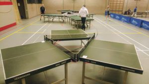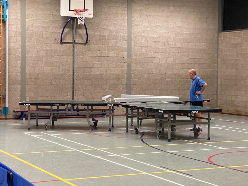 Wat was de opzet: over de zaal verspreid waren vijf opstellingen met elk drie tafels of tafelhelften, die zodanig waren neergezet dat de korte zijden met de punten tegen elkaar een driehoek vormen, zodat je een potje kon pingpongen met zijn drieën: bij het retourneren kon je dus kiezen om de bal naar de ene of naar de andere tegenstander te spelen, net hoe het uitkwam. Daarbij was een onnavolgbare puntentelling en een ingewikkeld poule- en knock out-systeem bedacht dat zelfs Pythagoras himself nooit had kunnen begrijpen. Maar het kwam erop neer dat je strategisch beter richting de een dan naar de ander kon spelen. Om het nog ingewikkelder te maken was het in de poulewedstrijden de bedoeling om zoveel mogelijk punten te scoren, maar in de knock out-fase juist niet. Of zoiets. Nadat via weging was bepaald wie mocht starten met serveren brandde de strijd los. Dat wegen moet je dan letterlijk nemen: alle Overhezers werden vooraf op de waagschaal, nee weegschaal gezet. De meter sloeg menigmaal iets te ver in het rood. Voordeel was dan wel dat je mocht beginnen.