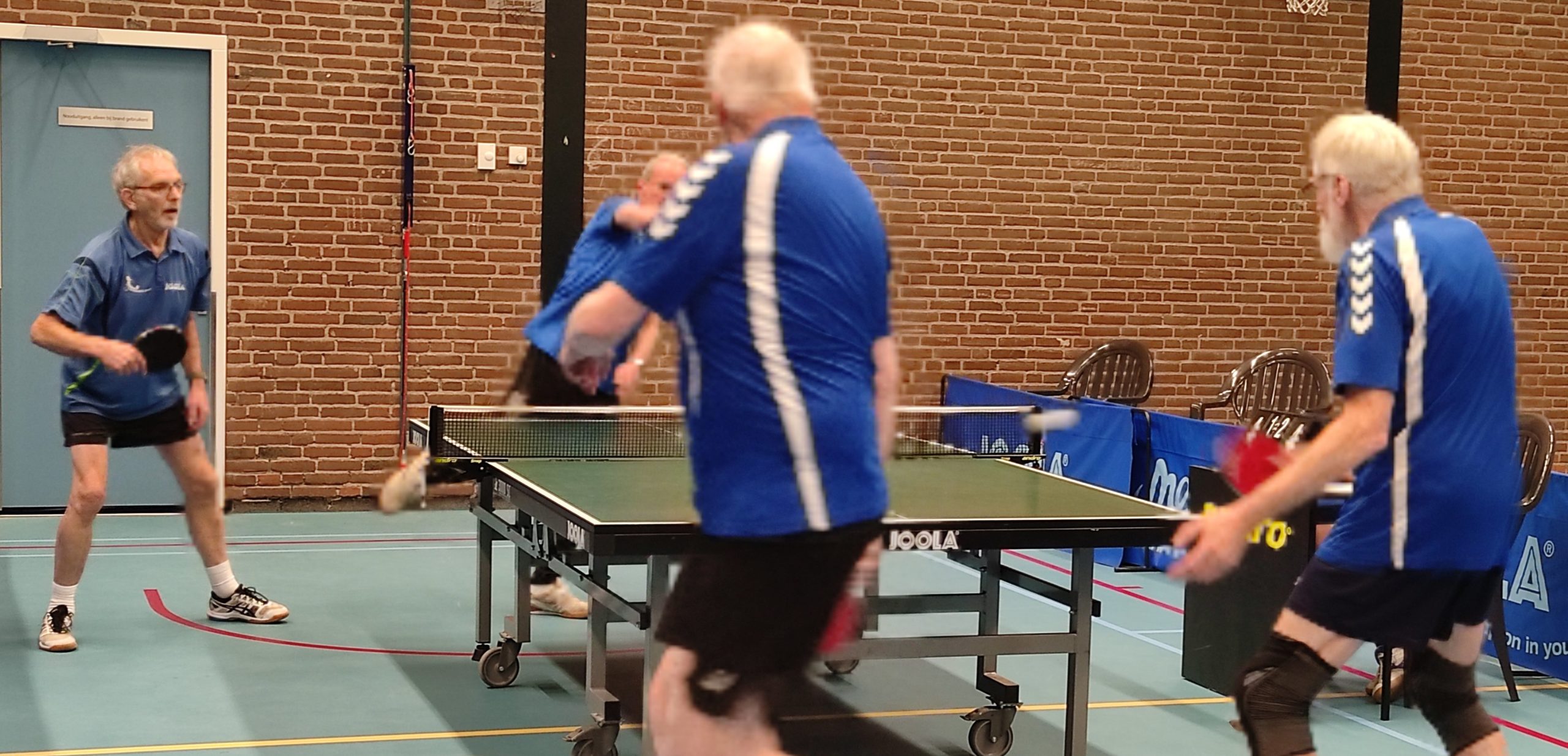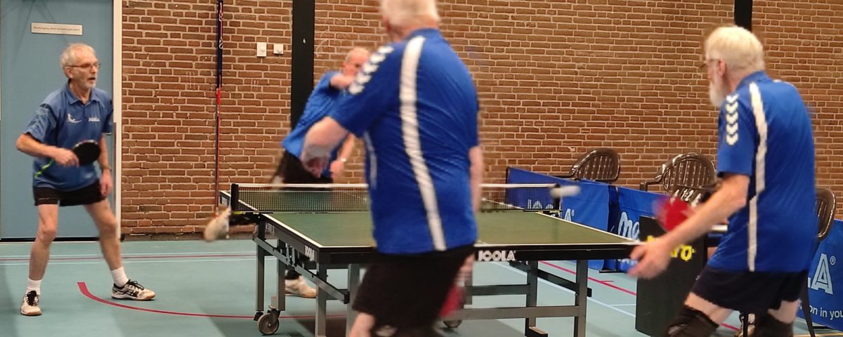 Ook Overhees 4 scoorde er goed op los: 3-2 tegen DTV Smash 4. Daan won zijn beide solo’s en speelde de hoofdrol. Sterker: hij speelde een heldenrol! Tegen de veel hoger genoteerde Albert Aarts was het bloedspannend tot de laatste slag. Daan kreeg op 8-10 in de vijfde game twee matchpoints tegen, maar wist deze koelbloedig weg te werken, waarna hij zich naar een heldhaftige 16-14 knokte: goed geDAAN!!! Ton speelde zijn eerste competitiewedstrijd en greep net als Daan Harry Hoekstra bij de kladden, waarmee er drie punten in de wacht waren gesleept. daar bleef het bij, want ook hier ging de dubbel naar de tegenstanders, hoewel Ton er zijn karakteristieke smash uit gooide (zie foto), de Ton Shuffle.