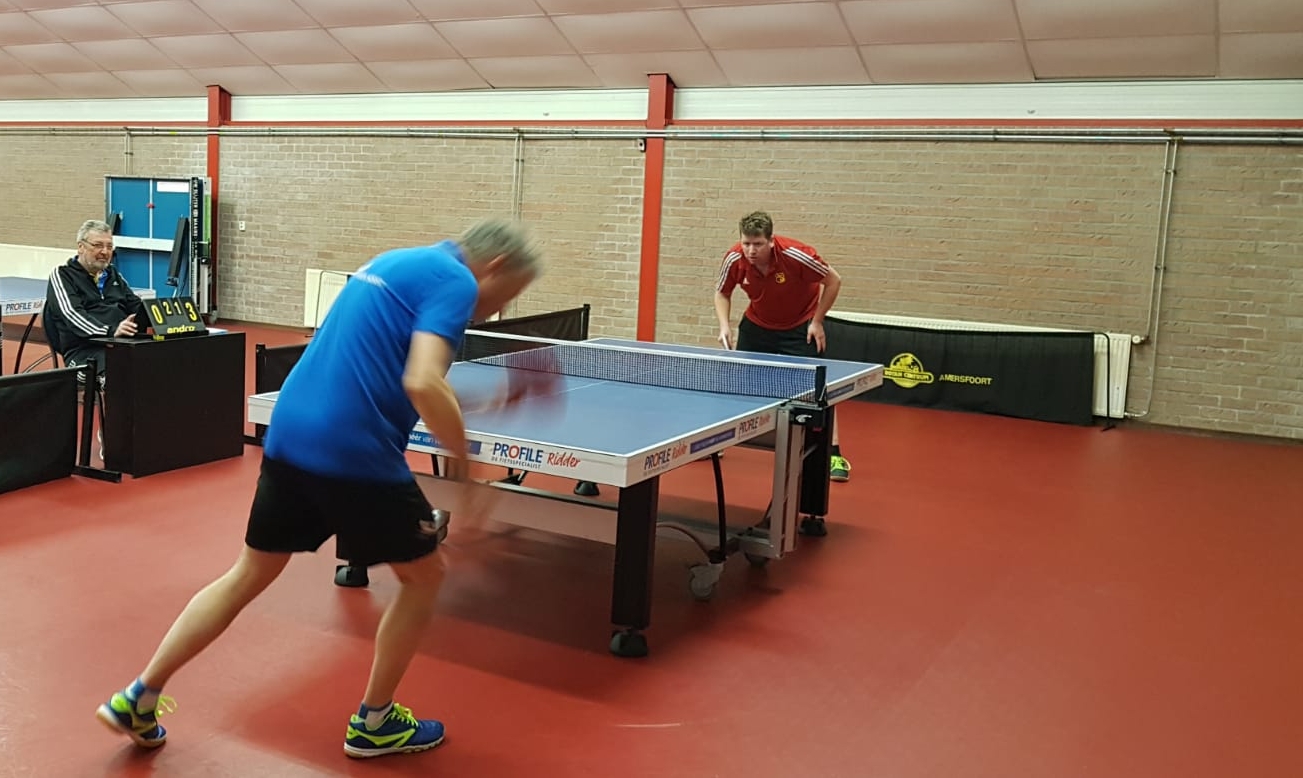 Overhees 2 en REGA 6 stonden al voor de tweede keer tegenover elkaar. REGA-kopman Gert van de Kamp, alias de Kipcornknager, bleef in Soest ongeslagen en had aangekondigd ook in Nijkerk te zullen spelen. ‘Maar dan krijgen jullie wel een teamschoteltje van ons’, voegde hij er geruststellend aan toe. Dat is altijd fijn, maar het vooruitzicht op weer een serie kansloze nederlagen is dat minder. Groot was dan ook de verbazing bij Overhees dat bij aankomst in Nijkerk geen Gert te bekennen was, ook niet toen de wedstrijd al lang had moeten beginnen. Hij was zelfs onbereikbaar voor zijn teammaten. Was Prins Bitterbal I misschien carnaval aan het vieren? Geen idee, maar feit is dat REGA met hun op papier twee minste spelers, Rinko van de Veen en Jan Peter ‘JP’ van Meerveld, ging beginnen aan de strijd, nota bene in een wedstrijd die op hun eigen verzoek naar voren was verschoven! Toen na twee wedstrijden toch echt moest worden besloten of er nog een speler C op het wedstrijdformulier zou komen en zo ja wie dan, keken de Nijkerkers eens rond in de zaal: het was rustig in deze inhaalweek, maar er waren wel een paar dames aan het trainen. Zou één van hen misschien in mogen/kunnen/willen vallen? Jawel: Wendy Simon, competitiegerechtigd en spelend in de 6e klasse, mocht reglementair invallen, had tijd en was bereid om haar clubgenoten uit de brand te helpen. Chapeau voor deze aardige en sportieve dame!