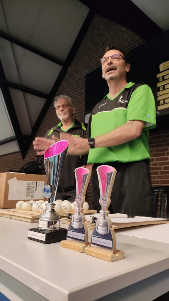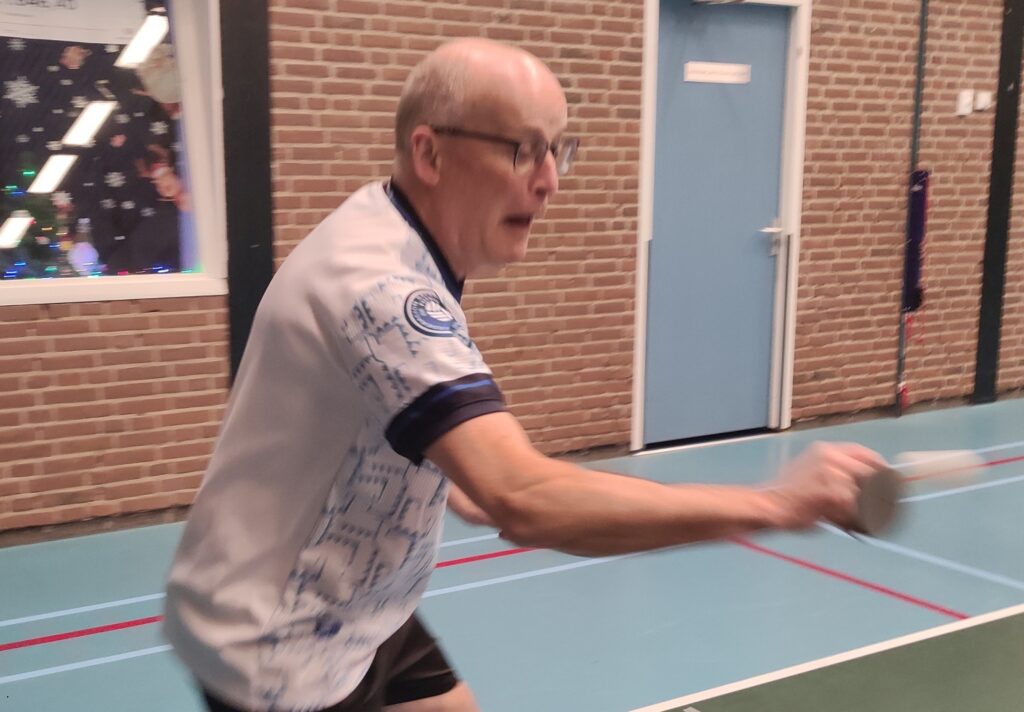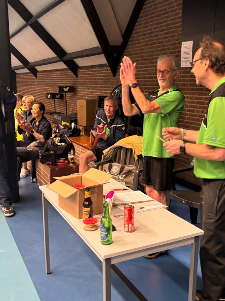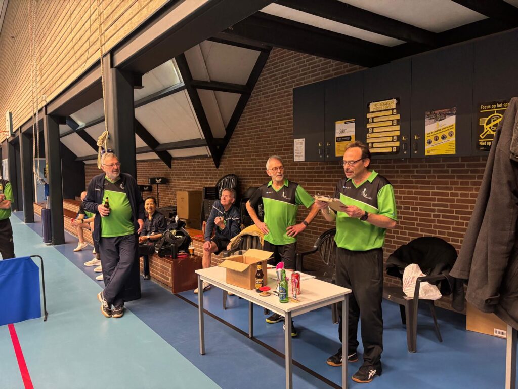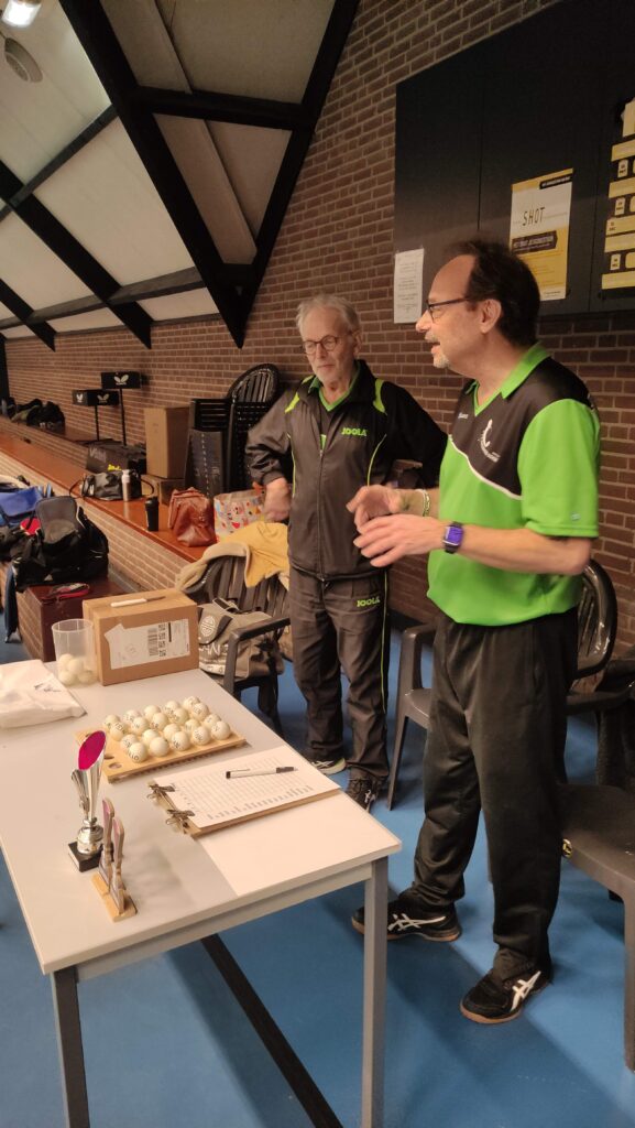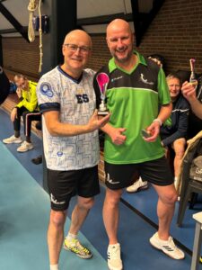 Goed, het toernooi zelf: zoals gezegd viel er prima te spelen met de Twinspin®. Spectaculaire rally’s all over the place. Daadwerkelijk zweten, wat wel eens anders is bij het Handicaptoernooi. En na zes ronden bleek er één speler die al zijn 12 sets had gewonnen. Dat was natuurlijk Ruben. Zoals Ruben ook traditioneel als eerste eindigt bij het Nieuwjaarstoernooi (daarover later meer) en daarmee traditioneel náást de prijzen grijpt, greep hij ook nu weer helemaal mis. Zijn teamgenoot Joanna scoorde iets te weinig punten. Mario en Frank wonnen ook al hun sets, op één na: tegen elkaar speelden ze gelijk, waardoor zij beiden op 11 punten eindigden. Hun beider partners, respectievelijk Allan en Matthijs, scoorden toevalligerwijs óók evenveel punten (beiden 7), waardoor de beide teams ex aequo op de eerste plaats finishten met 18 punten. De gemiddelde spelersrating van Allan en Mario is echter wat lager dan die van Matthijs en Frank, waardoor Allan en Mario de glorieuze winnaars zijn van de 2025-editie van het Handicaptoernooi en om en om de wisselbeker op hun schoorsteenmantel mogen laten blinken. Voorwaarde daarbij is dat Mario de ene week van Weesp naar Soest fietst om de bokaal naar Allan te brengen en Allan de week daarna de fietstocht van Soest naar Weesp onderneemt om Mario te kunnen laten genieten van het kleinood.