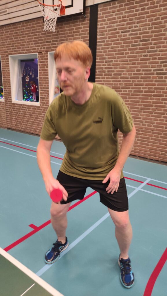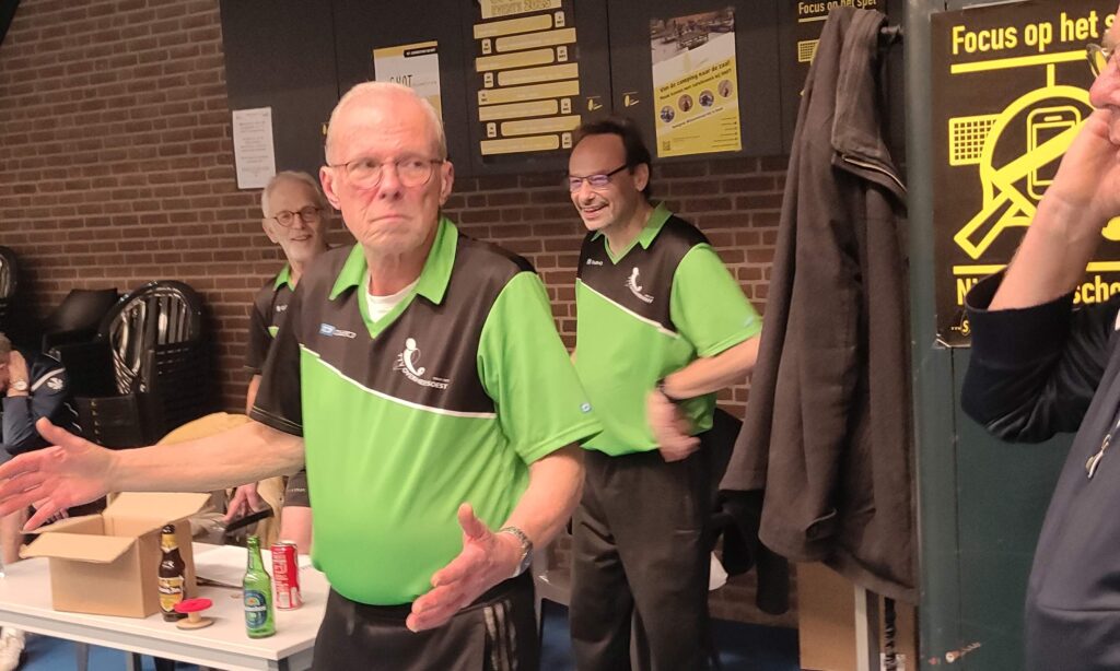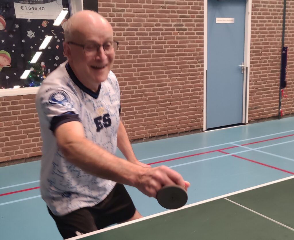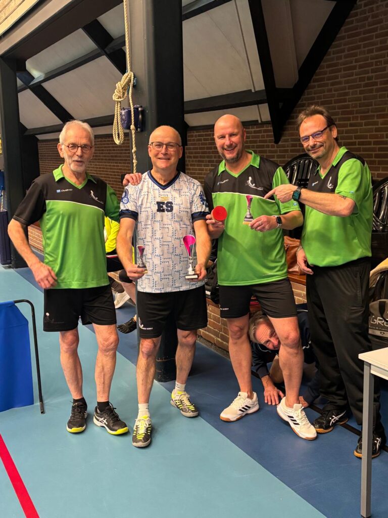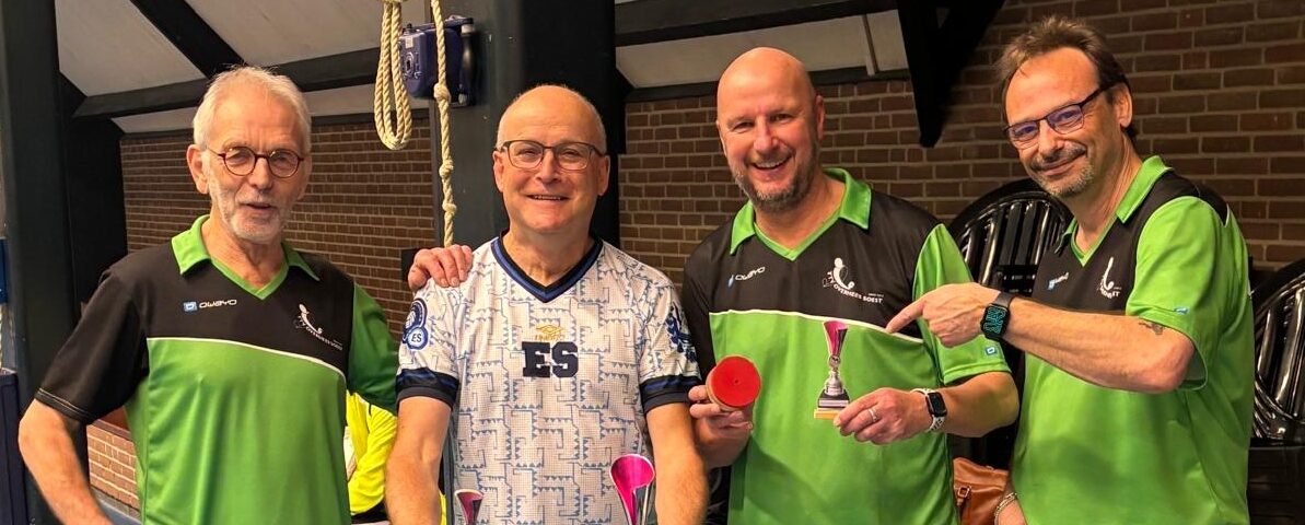 Goed, het toernooi zelf: zoals gezegd viel er prima te spelen met de Twinspin®. Spectaculaire rally’s all over the place. Daadwerkelijk zweten, wat wel eens anders is bij het Handicaptoernooi. En na zes ronden bleek er één speler die al zijn 12 sets had gewonnen. Dat was natuurlijk Ruben. Zoals Ruben ook traditioneel als eerste eindigt bij het Nieuwjaarstoernooi (daarover later meer) en daarmee traditioneel náást de prijzen grijpt, greep hij ook nu weer helemaal mis. Zijn teamgenoot Joanna scoorde iets te weinig punten. Mario en Frank wonnen ook al hun sets, op één na: tegen elkaar speelden ze gelijk, waardoor zij beiden op 11 punten eindigden. Hun beider partners, respectievelijk Allan en Matthijs, scoorden toevalligerwijs óók evenveel punten (beiden 7), waardoor de beide teams ex aequo op de eerste plaats finishten met 18 punten. De gemiddelde spelersrating van Allan en Mario is echter wat lager dan die van Matthijs en Frank, waardoor Allan en Mario de glorieuze winnaars zijn van de 2025-editie van het Handicaptoernooi en om en om de wisselbeker op hun schoorsteenmantel mogen laten blinken. Voorwaarde daarbij is dat Mario de ene week van Weesp naar Soest fietst om de bokaal naar Allan te brengen en Allan de week daarna de fietstocht van Soest naar Weesp onderneemt om Mario te kunnen laten genieten van het kleinood.