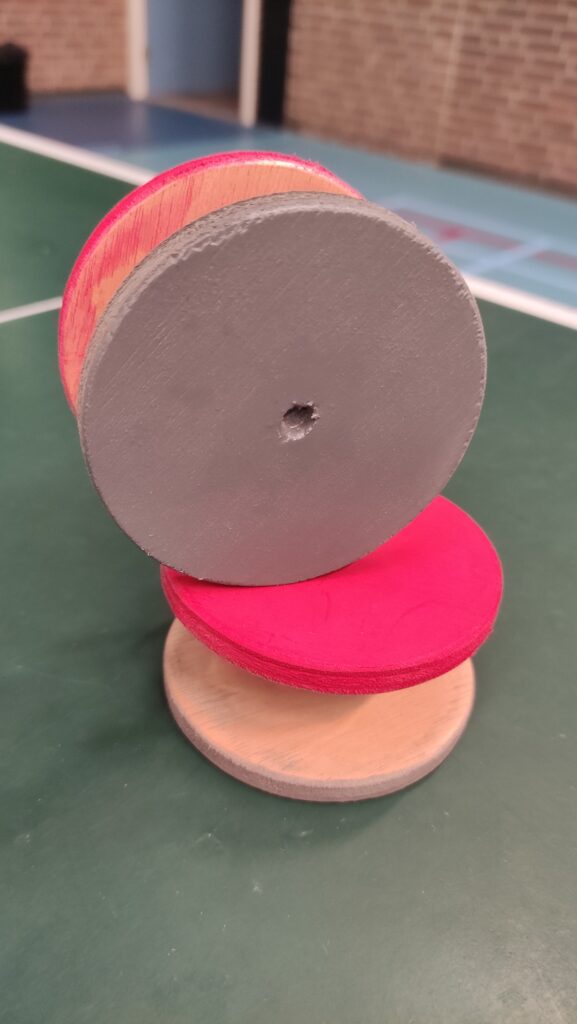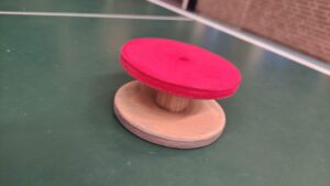So far so good, maar wat zou dan toch die handicap zijn? Dit is toch het Handicaptoernooi? Daar kwam het mysterieuze dichte doosje in beeld: weldra zou het zegel worden verbroken. En daar kwamen ze tevoorschijn: een stuk of 20 Twinspins (Trademark 2025 Daan/Mark). Twee ronde multiplex schijfjes met een diameter van een centimeter of acht, verbonden met een rond stukje hout op een centimeter of drie afstand van elkaar. Net genoeg afstand om het ding tussen je vingers te frotten, of eigenlijk net te weinig. One size fits all. Nou ja, ‘fits’ is wat positief geformuleerd. En ‘all’ klopt ook niet helemaal, want voor de kolenschoppen van Xavier was er een Twinspin® XXL. Laat hij zich nou net kort van tevoren hebben afgemeld. Maar het was een prachtig ding dat iets weg had van een diabolo, of een jojo zonder touw. Netjes afgewerkt en mooi in de verf ook, met één kant zwart en één kant rood natuurlijk. Dus dat ’twin’ begrijpen we. Maar hoe zouden Daan en Mark op ‘spin’ zijn gekomen? Je hoefde het niet uitgeprobeerd te hebben om direct te weten: met dit ding valt absoluut niet te spinnen!