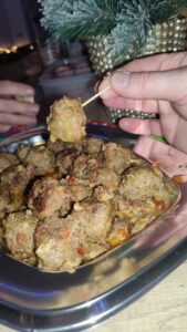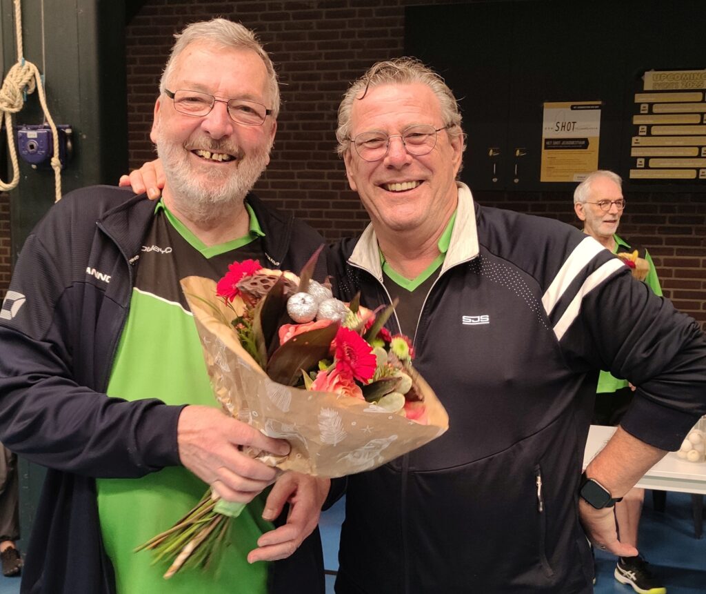 Tussen de bedrijven door gingen natuurlijk weer hapjes rond, van de hand van meesterchef Peter. Voorzitter Jos memoreerde in zijn nawoord de traditie die hier aan het ontstaan is, waarbij er zeker nog iets in aanmerking komt voor een Trademark: Peters Balletjes™, die hard bezig zijn definitief een plek te veroveren in het rijtje traditionele hoogtepunten van de clubgeschiedenis. Peters Balletjes™ bevatten precies de juiste combinatie en hoeveelheid kruiden, het geheim van de kok. Uiteraard verdiende dat bloemen uit handen van Jos, die vervolgens uiteraard ook toernooileiders Mark en Daan in de bloemetjes zette, nadat eerst Ton nog even zijn moment of fame pakte door de talrijke aanwezigen uit te nodigen voor alweer het volgende event, het Nieuwjaarstoernooi op 6 januari 2026. Ook weer zo’n vernuftig iets dat zomaar uit een creatief Overhezer brein komt: Tons Individuele Dubbeltoernooi©, bedenk het maar. Komt allen!