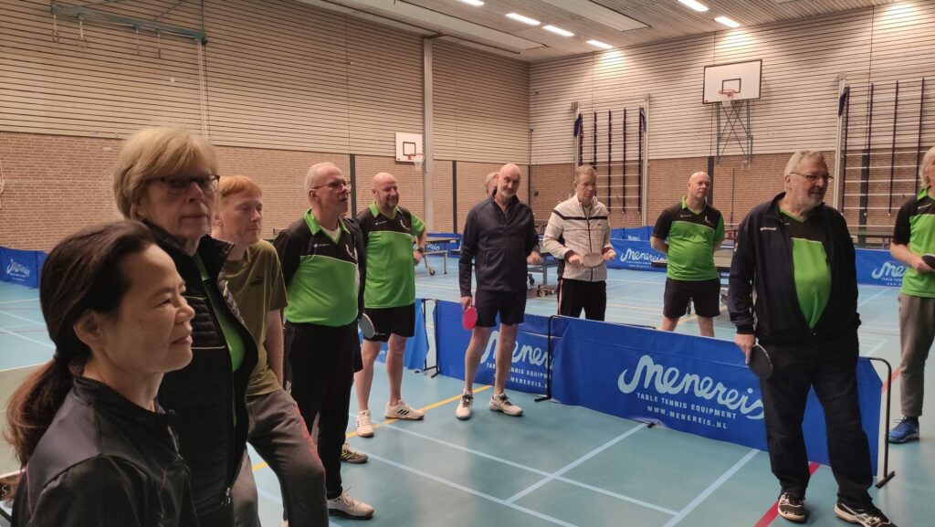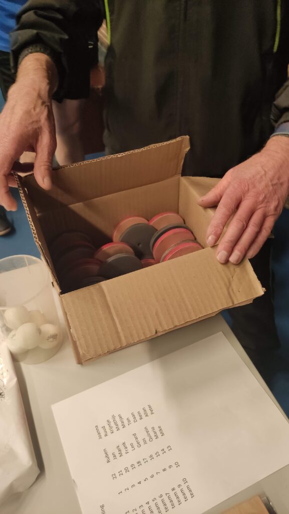Ze waren er weer bijna allemaal, de trouwe leden van Overhees. Natuurlijk met hun batje in de aanslag. Wisten zij veel dat ze dat ding onnodig mee hadden gesleept. Het gebruikelijke slaghout kon linea recta weer de tas in, want co-organisator Mark meldde dat alle deelnemers vanavond een alternatief zouden krijgen uitgereikt om het balletje te raken. De ervaren Overhezer weet dan genoeg: co-organisator Daan is weer aan het hobbyen geweest. Maar wat er dan zou zijn ontsproten aan hun creatieve geest bleef nog even geheim achter de gesloten flappen van een klein doosje op tafel. Om de spanning hoog op te voeren ging Mark eerst even de spelregels uitleggen. Lang verhaal kort: Daan en Mark hadden teams van twee spelers samengesteld. De speler met de hoogste rating werd gekoppeld aan de laagste rating, de een na hoogste rating aan de een na laagste rating, enzovoort. Ieder zou individueel twee games tot de 11 spelen tegen een willekeurige door loting bepaalde tegenstander en bij elke partij waren 0, 1 of 2 punten te verdienen voor je team. Teamgenoten kunnen niet tegen elkaar loten en elke speler kon maar één keer tegen dezelfde tegenstander loten. Het team dat na zes ronden de meeste punten heeft verzameld gaat met de wisselbeker naar huis. Bij gelijk aantal punten wint het team met de laagste gemiddelde spelersrating.