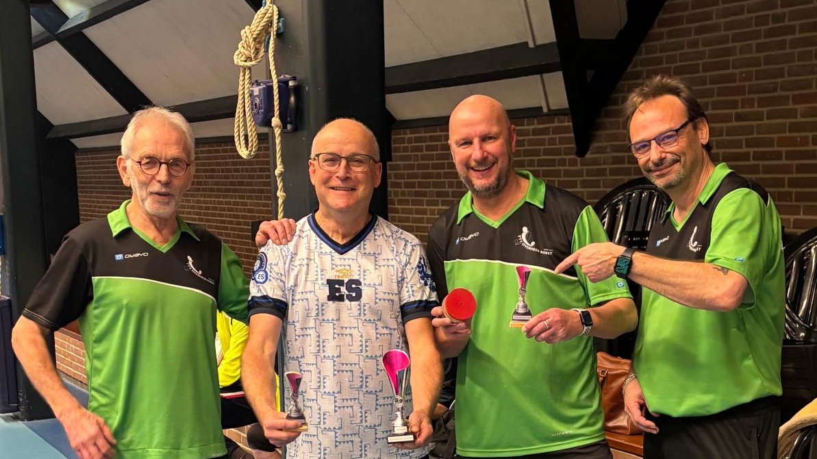 Goed, het toernooi zelf: zoals gezegd viel er prima te spelen met de Twinspin®. Spectaculaire rally’s all over the place. Daadwerkelijk zweten, wat wel eens anders is bij het Handicaptoernooi. En na zes ronden bleek er één speler die al zijn 12 sets had gewonnen. Dat was natuurlijk Ruben. Zoals Ruben ook traditioneel als eerste eindigt bij het Nieuwjaarstoernooi (daarover later meer) en daarmee traditioneel náást de prijzen grijpt, greep hij ook nu weer helemaal mis. Zijn teamgenoot Joanna scoorde iets te weinig punten. Mario en Frank wonnen ook al hun sets, op één na: tegen elkaar speelden ze gelijk, waardoor zij beiden op 11 punten eindigden. Hun beider partners, respectievelijk Allan en Matthijs, scoorden toevalligerwijs óók evenveel punten (beiden 7), waardoor de beide teams ex aequo op de eerste plaats finishten met 18 punten. De gemiddelde spelersrating van Allan en Mario is echter wat lager dan die van Matthijs en Frank, waardoor Allan en Mario de glorieuze winnaars zijn van de 2025-editie van het Handicaptoernooi en om en om de wisselbeker op hun schoorsteenmantel mogen laten blinken. Voorwaarde daarbij is dat Mario de ene week van Weesp naar Soest fietst om de bokaal naar Allan te brengen en Allan de week daarna de fietstocht van Soest naar Weesp onderneemt om Mario te kunnen laten genieten van het kleinood.