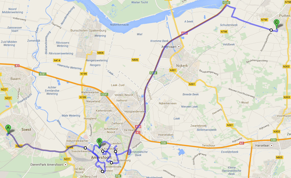 Ruim op tijd stond hij klaar om Gerard op te halen, die zijn laatste happen van het avondeten nog zat weg te werken en zijn volledige bepakking nog van boven moest halen. Vervolgens Stefan opgehaald, waar hetzelfde ritueel zich herhaalde. Putten uit dus. Niet om de hoek, maar ook weer geen monsteretappe, zou je zeggen. Daar dacht het navigatiesysteem van Aloys dus wel even anders over. We weten nog steeds niet wat het ding bezielde (en beter nog… Waarom we niet gewoon de borden snelweg zijn gevolgd) maar feit is dat we alle woonwijken van Amersfoort ongeveer 3 keer hebben gezien, alvorens we eindelijk de snelweg op mochten van de domdom. Op bijgevoegd plaatjs een impressie van hoe ik denk dat we zijn gereden 🙂