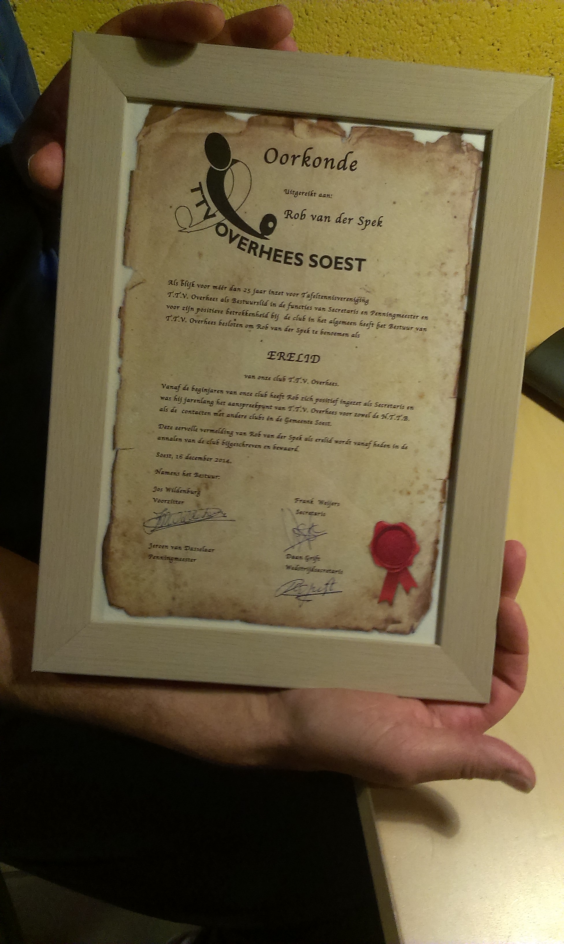 Rob is inmiddels ruim 30 jaar lid van de vereniging en daarvan heeft hij zich liefst 24 jaar ingezet als bestuurslid. Als blijk van waardering voor deze enorme betekenis voor de club heeft het bestuur hem benoemd tot erelid. Onder ovationeel applaus ontving Rob uit handen van Jos een officiële oorkonde en een Parker ballpoint met T.T.V. Overhees inscriptie.