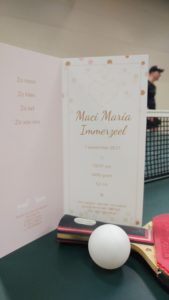 Het jonge gezin heeft inmiddels een kleine delegatie van de vereniging op bezoek gehad en voorzitter Jos heeft hen namens het bestuur en alle leden van harte gelukgewenst en een presentje overhandigd. En toen Ruben hoorde dat de uitwedstrijd van team 1 werd uitgesteld maakte hij van de gelegenheid gebruik om even een bezoekje te brengen aan de club om Maci’s geboortekaartje persoonlijk af te geven, zie bijgaande foto (met op de achtergrond de verwekker van dit moois). Wat zal Maci trots zijn om een meervoudig clubkampioen van Overhees als papa te hebben!