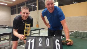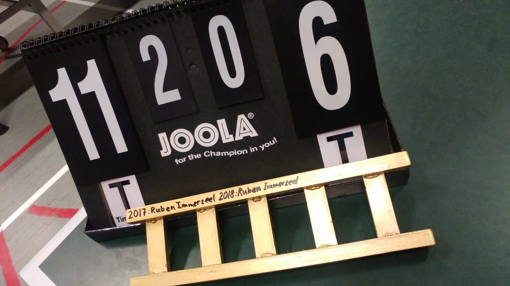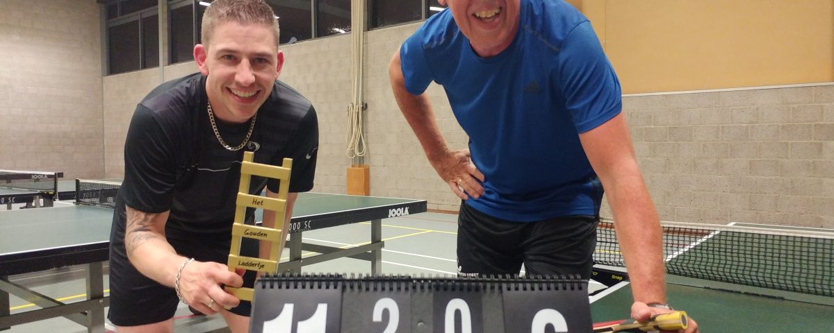 Hoe dan ook: Leo en Ruben gaven het beste van zichzelf. Ruben was al in de eerste maand van de laddercompetitie opgeklommen naar de top en gaf die positie niet meer af, Leo moest zware wedstrijden doorstaan om de finaleplek veilig te stellen. Hij deed er alles aan en in het begin van de pot bleef hij prima bij: in de eerste game wist hij via mooie aanvallen nog op een 8-7 voorsprong te komen. Ruben echter stelde vanaf dat moment duidelijk orde op zaken en met veel snelheid, kracht en precisie pakte hij de eerste game (11-8), de twee ook (11-nogwat) en de derde eveneens (11-6). En net als in 2017 (toen hij de finale won van Gerard) mocht Ruben na afloop dat prachtige Gouden Laddertje mee naar huis nemen, voorzien van inscriptie, ofwel: zijn naam werd er voor de tweede keer op geschreven met een dikke zwarte Eddingstift. Gefeliciteerd!