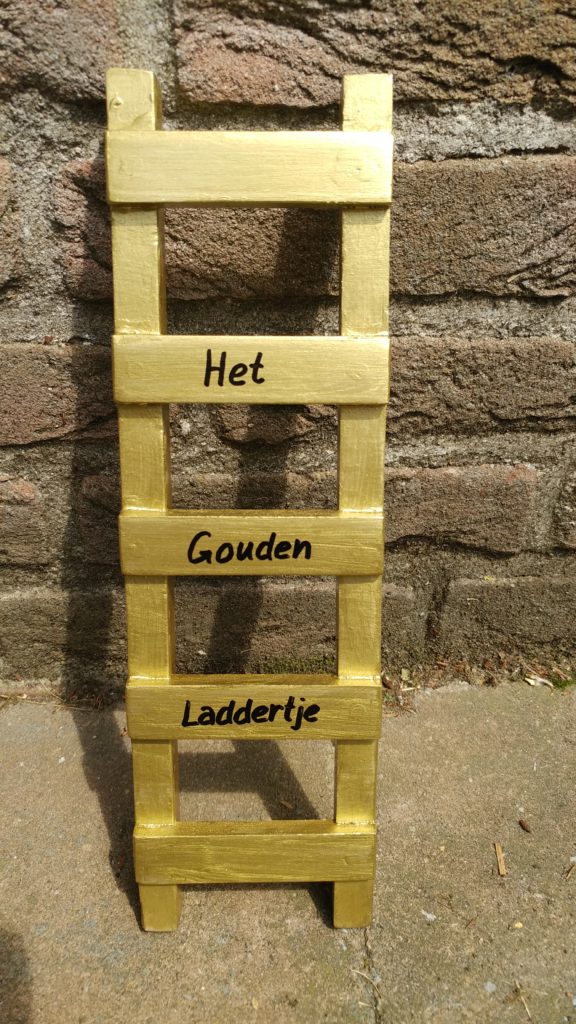 Reden voor de aanwezigen om hem uitbundig te feliciteren en natuurlijk wil je hem dan een flinke schouderklop geven. En dit was wat Ruben nog het meest had gevreesd: de felicitaties na afloop. Want o wat voelde hij nog die verse (en prachtige) tattoo die hij deze week op zijn bovenarm heeft laten zetten en wat doet het pijn als iemand er een vriendschappelijke klap op geeft. ‘Nee, nee, niet dáár!’ kermde de kersverse ladderkampioen die zijn bovenarm angstvallig verborgen hield voor de toestromende fans. Maar gelukkig is Ruben geen watje en toen Frank hem Het Gouden Laddertje had uitgereikt was er alleen nog maar het gelukzalige gevoel dat je hebt als je iets unieks in handen hebt. Ter plekke werd zijn naam op het Laddertje aangebracht. Ruben: van harte gefeliciteerd, de terechte winnaar die helemaal onderaan de ladder begon en via een snelle klim naar boven wekenlang bovenaan stond en dit uiteindelijk bekroont met de 1e prijs!