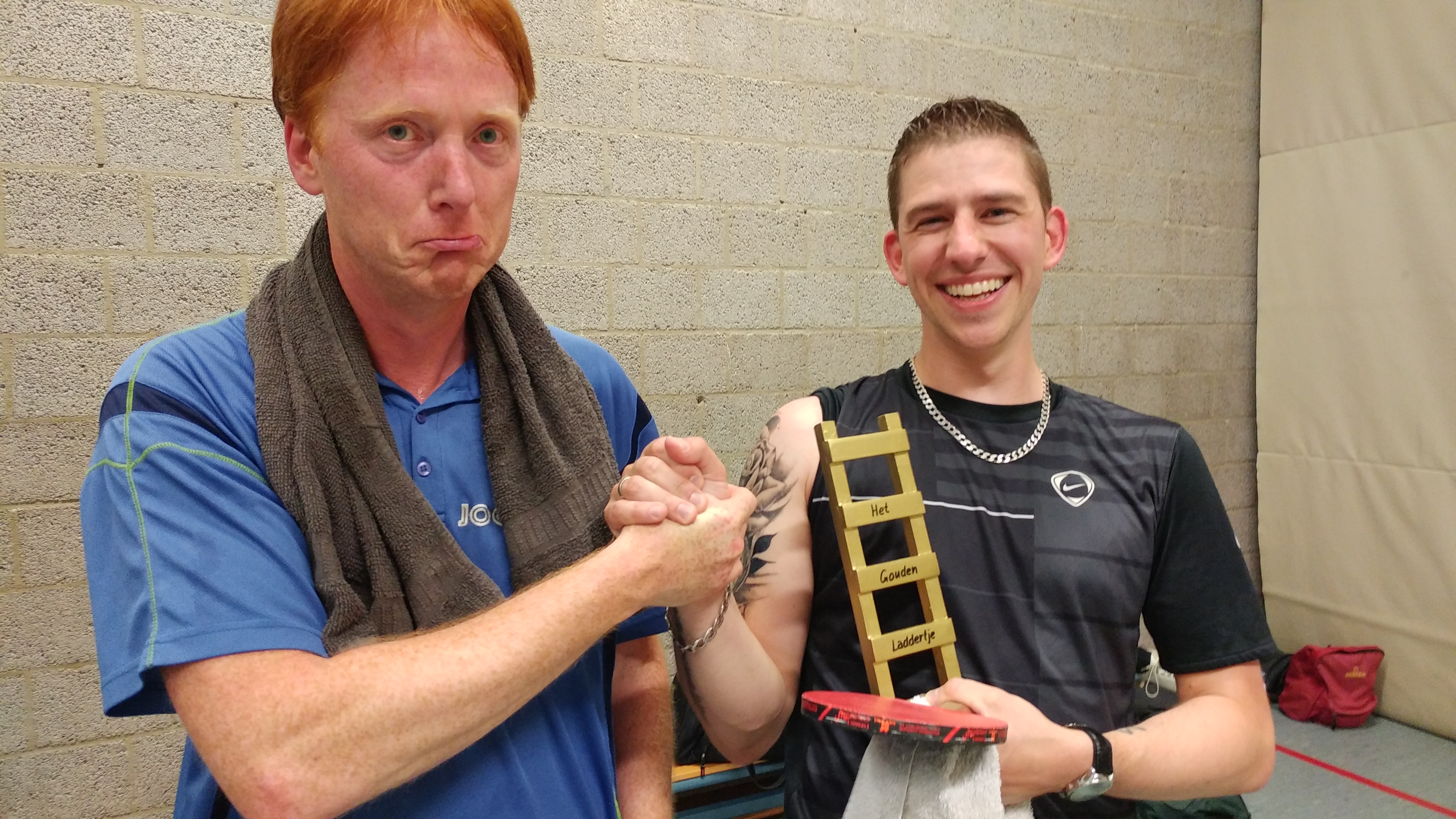 Ruben moest nu een tandje bij gaan zetten. Hij speelde voor zijn doen toch wel vrij behoudend. Later bleek waarom dat was. Maar ja: ook hij zag in dat er in een tafeltennisleven niet veel kansen komen op het winnen van een award als deze, dus hij ging er nog eens voor. De vierde game was het uiteindelijk toch Ruben die zich de sterkste van de twee toonde. Tegen de 11-7 had Gerard niet veel meer in te brengen en zijn geluk was ook een beetje op. Zo won de favoriet uiteindelijk toch van de underdog en mag Ruben zich de winnaar nemen van de eerste laddercompetitie van TTV Overhees.