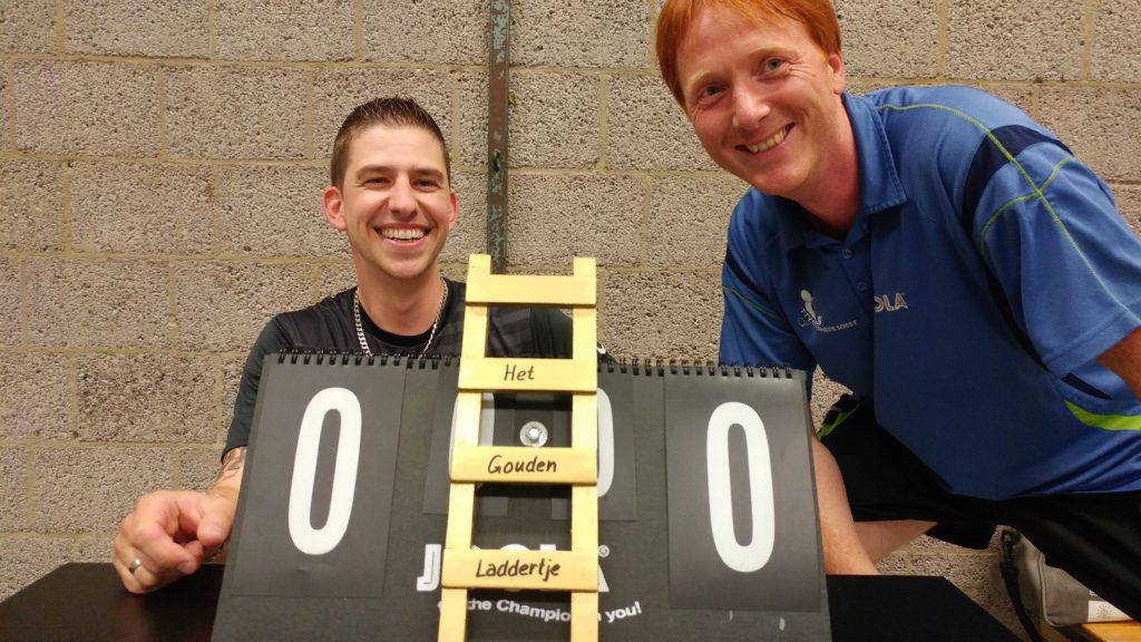 Daan heeft zijn creativiteit de vrije loop gelaten en kwam met dit mooie kleinood dat iedereen wel in zijn prijzenkast zou willen hebben: een hoogwaardige miniatuurladder van ‘echt’ bladgoud! De trofee werd voorzichtig tentoongesteld tegen het scorebord, zodat de begeerte van de beide finalisten goed op gang werd gebracht en de toeschouwers zich konden opmaken voor een attractieve strijd.