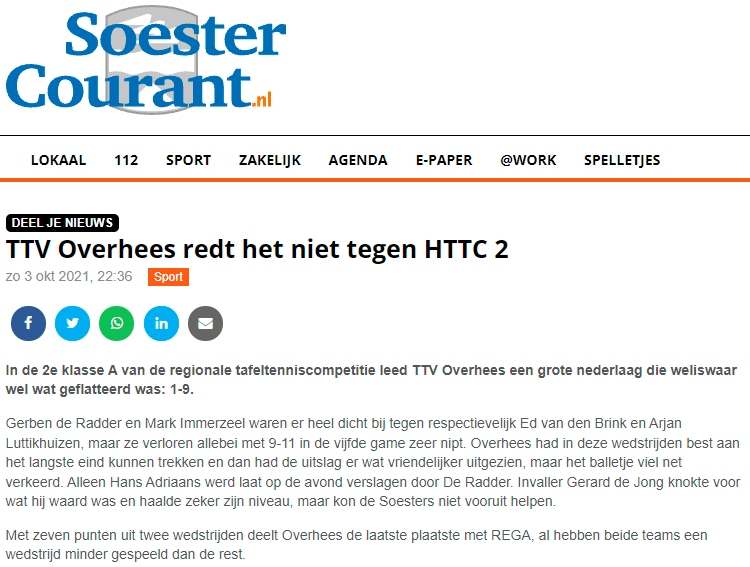 Soester Courant 3-10-’21: TTV Overhees redt het niet tegen HTTC 2
