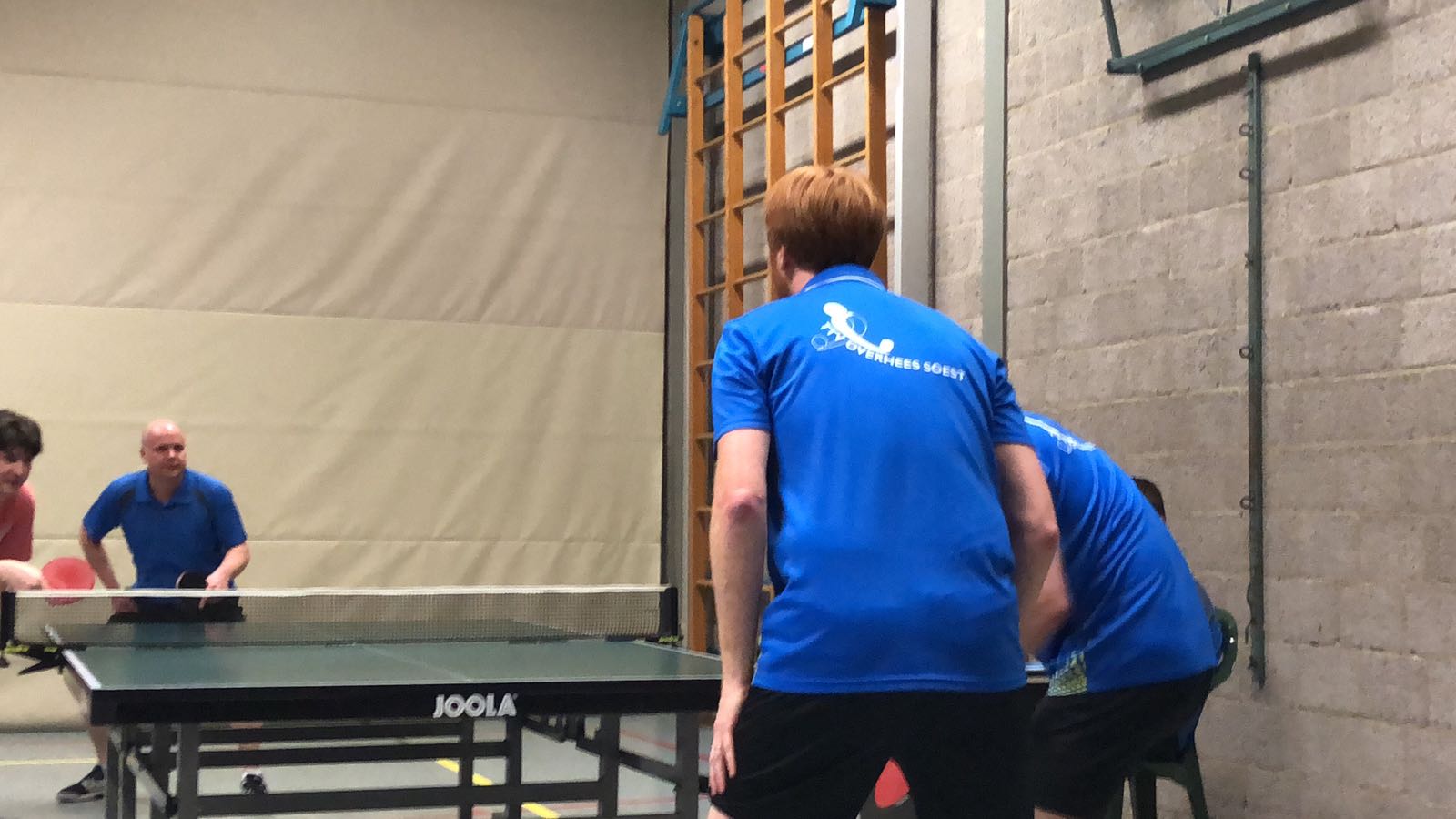 Pas in het vijfde duel wist Overhees te scoren. Leo kwam nog met 0-2 achter, maar was al met al toch terecht Hans de baas: knap teruggekomen. Zijn prestatie tegen Ronald sprong echter nog meer in het oog. De WIK’er speelt aan één kant met noppen en wisselt voortdurend zijn batje, waardoor het lastig is om te voorzien wanneer hij nu met zijn noppenkant slaat en wanneer niet. Daarnaast is hij uiterst vast en beschikt hij over een lastige service. Leo maakte echter optimaal gebruik van zijn mindere kant: hij valt nauwelijks aan. Geduld is dus een schone zaak tegen Ronald en dat hoef je Leo niet uit te leggen. Die is zelf ook niet vies van een rally die minutenlang duurt en het werd dan ook een megapartij die meer weg had van schaken dan van tafeltennis. De meningen aan de kant waren verdeeld: van ‘niet om aan te zien, ik had die bal al lang een lel gegeven’ tot ‘wat een geweldig strategisch schouwspel is dit, knap hoe ze allebei zo fantastisch geconcentreerd en gefocust blijven’. De spelers gaven elkaar aanvankelijk geen duimbreed toe en hielden allebei goed stand. Het was de scheidsrechter die als eerste opgaf: ‘graag even iemand anders tellen, ik zie het allemaal niet meer zo scherp met die lange rally’s en ik moet zo zelf spelen, het wordt me allemaal te veel’. Begrijpelijk.