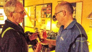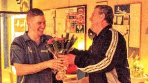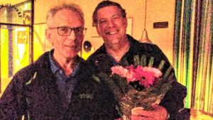 Bloemen van voorzitter Jos voor mede-organisator Daan