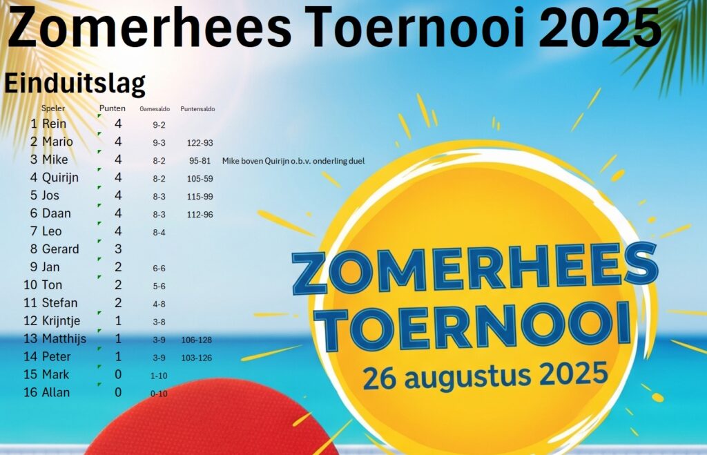 De opening van het nieuwe seizoen werd gevierd met de eerste editie van het Zomerhees Toernooi, het toernooi waar spelers met lagere rating een voorgift krijgen op spelers met hogere rating, waardoor in theorie de einduitslag één grote loterij is. Rein sloeg opnieuw genadeloos toe: na de eerste plaats op het Handicaptoernooi van vorig jaar en zijn een-na-laatste plek op het Nieuwjaarstoernooi begin dit jaar (waarmee hij als eerste een prijs mocht kiezen) scoorde hij binnen een jaar een ongeëvenaarde prijzenhattrick door het Zomerhees Toernooi op zijn naam te schrijven. De gouden Zomerhees Cup staat een jaar lang op zijn nachtkastje te pronken.
